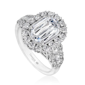 Many women today want a larger looking engagement ring. There are technologically advanced diamond cuts (such as L’Amour Crisscut) that provide a larger silhouette size over traditional “old-school/generic” cuts. Halo styling, where the center diamond is surrounded by a frame of other diamonds has also become popular as it gives the ring a larger look. Additionally, colored gemstones, often at less cost than a diamond, are gaining popularity with someone who wants a larger ring.